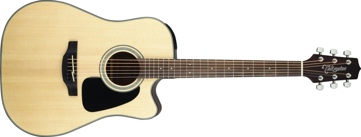 Takamine GD30-CE Dreadnought Cutaway Natural 6-string Acoustic/Electric Guitar The GD30CE is a stage-worthy acoustic/electric dreadnought guitar that features solid-top construction, a soft Venetian-style cutaway and a superior-sounding Takamine electronics system. Ready for any performance situation, the GD30CE features a solid spruce top and mahogany back and sides that produce a rich, resonant sound. The slim mahogany neck and 12”-radius rosewood fingerboard provide great feel and playability, while the onboard Takamine TP-4TD preamp system gives you a built-in tuner with three-band EQ and gain controls for excellent amplified performance and versatility. Other great features include a pin-less rosewood bridge, synthetic bone nut and split bridge saddle, rosewood headcap, pearloid rosette and dot inlays, chrome die-cast tuners and a beautiful gloss finish. Available in Natural and Black. Features Series: G30 Series Color: Natural Body Body Finish: Gloss Body Shape: Dreadnought Cutaway Bracing: Quartersawn “X” Body Back: Mahogany Body Sides: Mahogany Body Top: Solid Spruce Neck Neck Material: Mahogany Neck Finish: Gloss Scale Length: 25.3″ (643 mm) Fingerboard: Rosewood Fingerboard Radius: 12″ (305 mm) Number of Frets: 20 String Nut: Synthetic Bone Nut Width: 1.6875″ (42.8 mm) Position Inlays: Pearloid Dot Electronics Special Electronics: Takamine TP-4TD Preamp with Built-In Tuner Hardware Bridge: Rosewood Hardware Finish: Chrome Tuning Machines: Chrome Die-Cast Miscellaneous Strings: D’Addario® EXP 16 Coated Phosphor Bronze (.012-.053 Gauges)