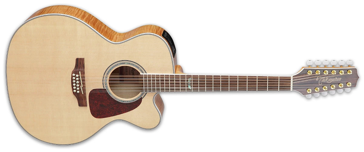 With its mighty jumbo body style, solid-top construction, stunning cosmetic features and premium electronics, the GJ72CE-12 is a commanding acoustic/electric 12-string guitar that is built to perform. Featuring a solid spruce top and flame maple back and sides, the GJ72CE-12 produces all the lush, robust sound that players expect from a jumbo 12-string guitar. The slim mahogany neck and 12″-radius bound rosewood fingerboard provide great feel and playability, while the onboard Takamine TK-40D preamp system gives you a built-in tuner, three-band EQ and gain controls, mid contour switch, notch filter and EQ bypass switch for the ultimate in versatility and sound quality. Other great features include a synthetic bone nut and split bridge saddle, rosewood headcap, abalone rosette, abalone “reversed mountain” inlay at the 12th fret, gold die-cast tuners with pearl buttons, and a beautiful gloss finish.