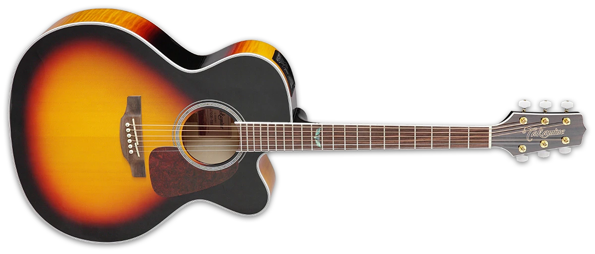 Featuring a solid spruce top and flame maple back and sides, the GJ72CE produces all the volume and robust sound that players expect from a jumbo guitar. The slim mahogany neck and 12”-radius bound rosewood fingerboard provide great feel and playability, while the on-board Takamine TK-40D preamp system gives you a built-in tuner, three-band EQ and gain controls, mid contour switch, notch filter and EQ bypass switch for the ultimate in versatility and sound quality.