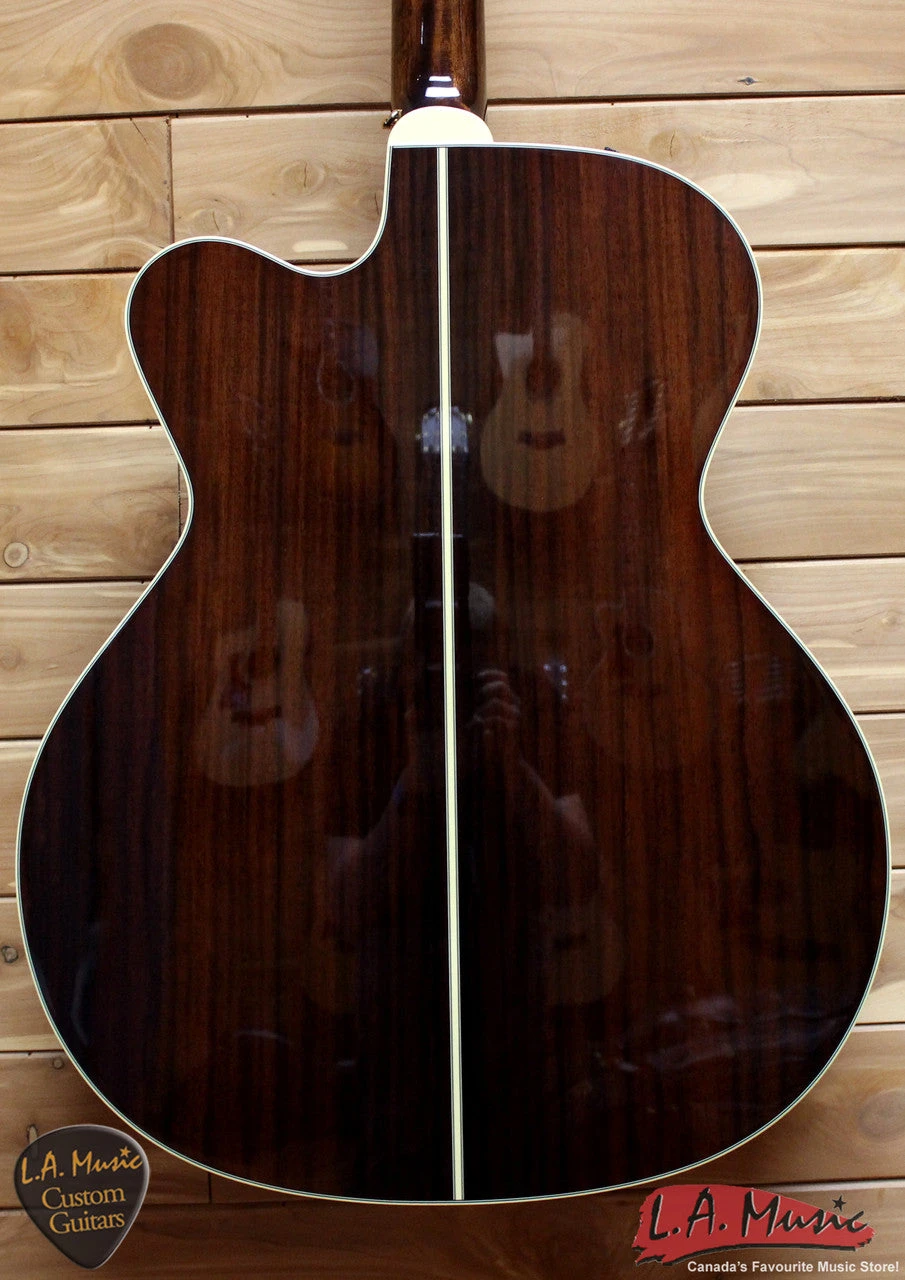Takamine’s P5JC jumbo cutaway model is loud and forceful, with a resonant solid spruce top with scalloped “X” top bracing for maximum volume, rosewood back and sides, a convenient Venetian cutaway for easy access to the upper reaches of the fingerboard, and elegant ivory body binding with dark wood purfling and abalone rosette.