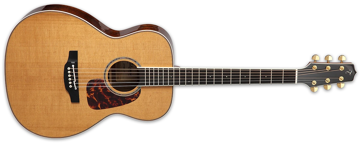 This great new orchestra model is an addition to the new TT Series of “Thermal Top” acoustics from Takamine. The top wood is treated with high heat, to modify the resins and sugars in the wood. This imparts a played in vintage tone and feel that is surprising in a brand new instrument. The CP7MO TT is an understated “working” guitar that features solid ovangkol back and sides for a balance of lows and highs across the guitar’s spectrum. The neck is made of mahogany with an ebony fingerboard. The nut is a traditional 45mm, that is great for players of a wide variety of styles. The body and neck are bound in elegant grained ivoroid. The guitars is appointed with subtle 3mm abalone dots, an abalone rosette, and a distinctive abalonne T on the headstock. Like the other guitars in the TT Series, it features the stealthy TLD-2 Line Driver preamp and Takamine’s legendary Palathetic pickup system.