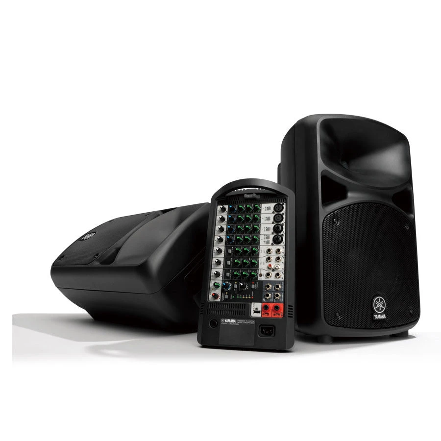 680-watt, portable PA system with 10-channel powered mixer, two 10″ speakers, iPod/iPhone USB connection, SPX digital reverbs, an onboard feedback suppressor and versatile EQ.